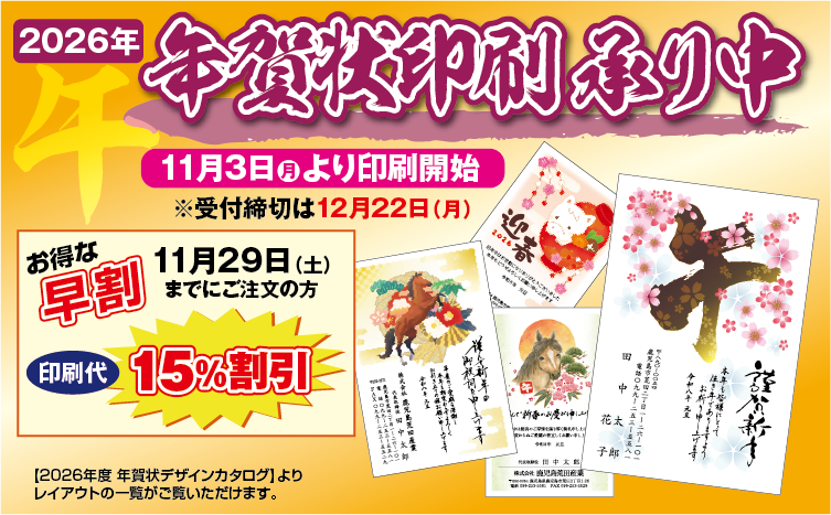 ※ご注文は承っておりますが、印刷は11月3日(月)より開始いたします。予約ご注文された方を優先的に、順次印刷してまいります。 ※印刷前に宛名書きされたはがきには印刷が出来ませんのでご注意ください。 ※宛名住所録(エクセルデータ)をご入稿いただければ、そのデータをもとに宛名印刷もいたします。 ※データ持ち込み・手書きの原稿のお持込も印刷いたします。 ※オリジナルのデザインも作成いたします。 ※年賀ハガキは当社でご用意いたします。 ※年賀ハガキのお持込みもお受けいたします。ただし、インクジェット用のハガキには印刷が出来ません。 ※ご注文はご注文フォームかFAX用注文書(PDF)にて承ります。また、ご来店いただければスタッフが詳しく説明いたします。(FAX用注文書はダウンロードしてお使いください) |